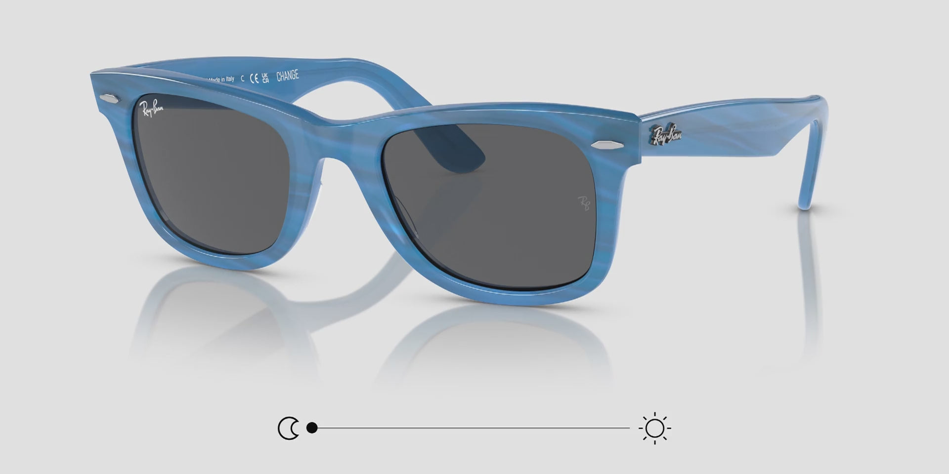 Frames that change colour with light. The iconic Wayfarer Original has been reimagined as part of the Change collection – our first series of light-responsive frames, powered by Transitions®. Sun lenses are paired with a frame featuring photochromic dyes that activate in seconds under UV. The pigments change to reveal unique striped markings and as the light gets stronger, so does the pattern.